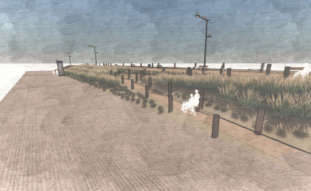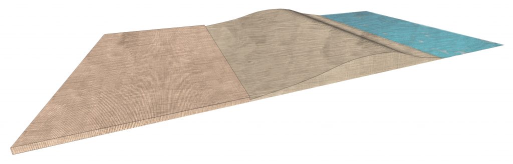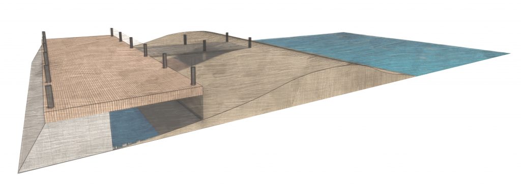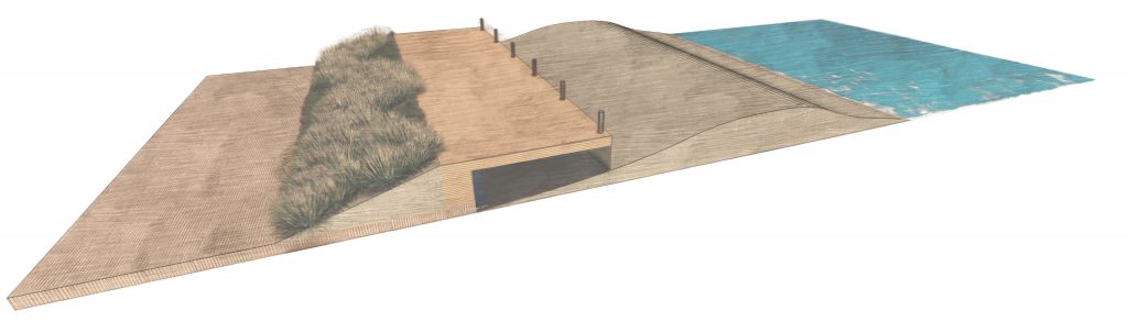 This is my individual portion of a larger masterplanning studio project for Atlantic City. Along the coast of Atlantic City, this design for a dual-level Boardwalk would be connected to the other interventions proposed by the rest of my group. The whole of its length, the overhanging portion of the Boardwalk will have grating to prevent access to the underside while providing a stormwater detention basin that can mitigate the impact of storm surge out of the Atlantic long enough for the other systems to fully absorb the floods. The grating will prevent debris from settling underneath the Boardwalk, and prevent significant damage to the underside. In some places, this also becomes an opportunity for additional living shoreline interventions, with the overhang serving as a viewing platform for visitors. I designed access to this overhang to have 5 modular typologies, which together would form the new Boardwalk.