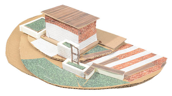 The bus stop design project was the final project for a class. For my redesign, I addressed water infiltration and stormwater management without changing the basic bus stop design. My site placement was a bus stop that regularly floods, has very little seating, and very little paved surface. Most of the ground surrounding the bus stop is dirt that turns to mud when it rains. Using a mix of red and white brick, I mimicked the style of Rutgers’ historic buildings while using permeable wood platforms to cover what would be a drain system that fills a series of cisterns. The cisterns would be within the white garden planters, and release collected rainwater over time back into the surrounding soils.
