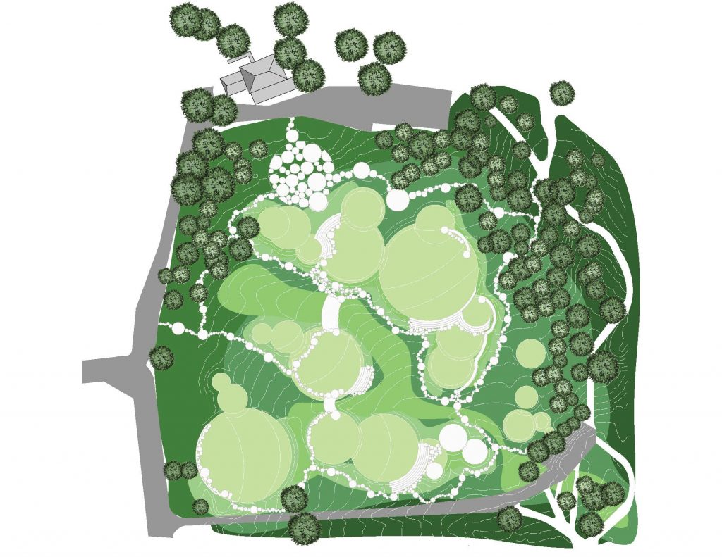 This project was an exercise in designing landscapes by manipulating the ground itself. I based my design on a series of interlocking circles, that stepped down the slope of Eagleton lawn to create a mix of open and closed views as you move downhill. The circles themselves are grass platforms, with hardscaped paths of smaller circles meandering up and through the platforms and across the planted drainage swales to facilitate access and a unique experience through the landscape.