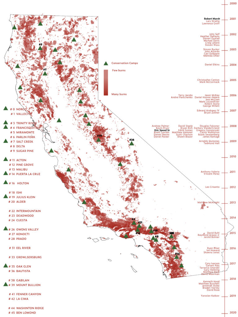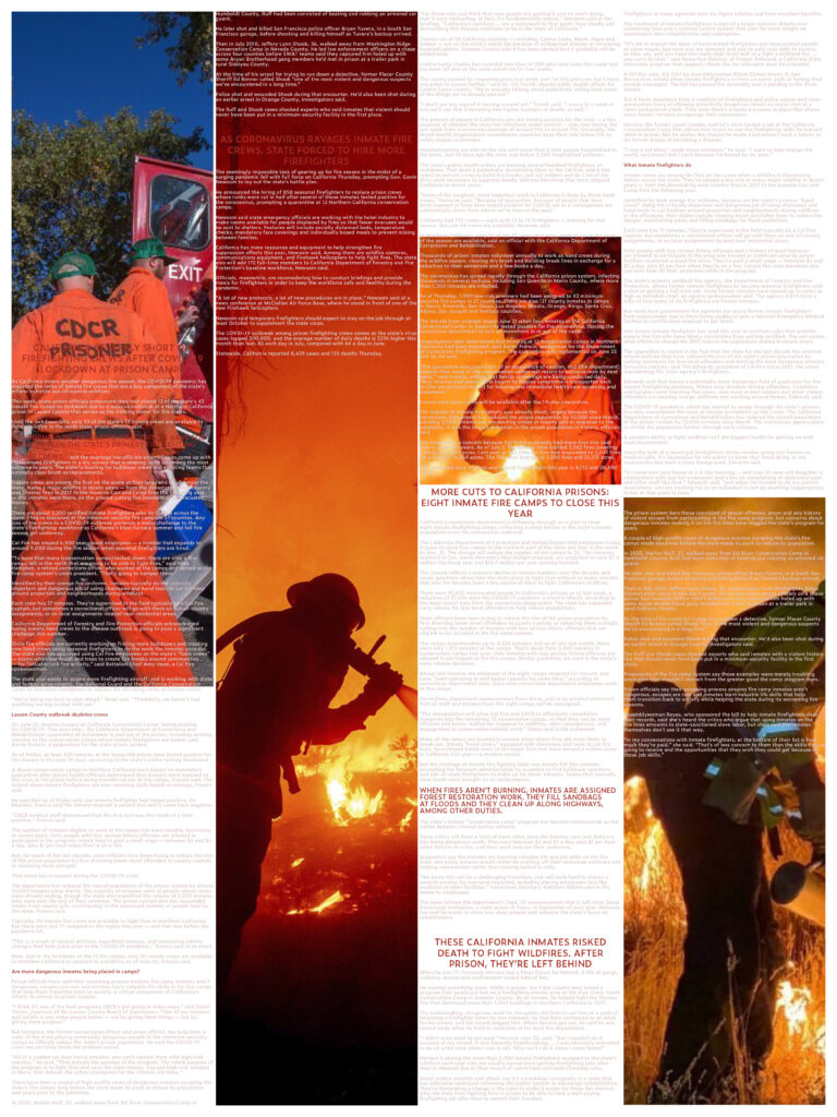 The historic extents of wildfires in California from 1980 through 2020, overlaid with the locations of inmate campsites. On the right is a timeline of all wildfire deaths associated with this specific program, and the highlighted names are inmates.A description of just a few of the camps, excerpts taken from the Cal FIRE website’s own descriptions of these camps. Dark highlights identify the unique traits of each campsite. Through articles from the Sacramento Bee, San Diego Tribune, Los Angeles Times, and the San Francisco Chronicle, I looked at public media’s descriptions of the program. The highlighted sections are the only places where these articles specifically mention the inmates themselves, rather than the fires or the program. In 2015, California passed a law that allows formerly incarcerated individuals to become full firefighters after release. Through the same set of media outlets, I looked at the difference in representation of these inmates between pre-2015 and post-2017, when the law went into full effect. This exploration ends with stories from the inmates themselves, via the California prison’s website, about how this program has changed their lives in their families and communities.