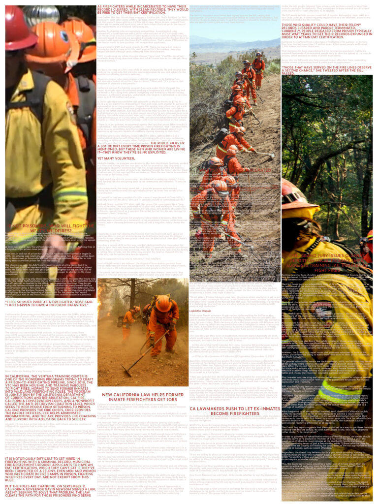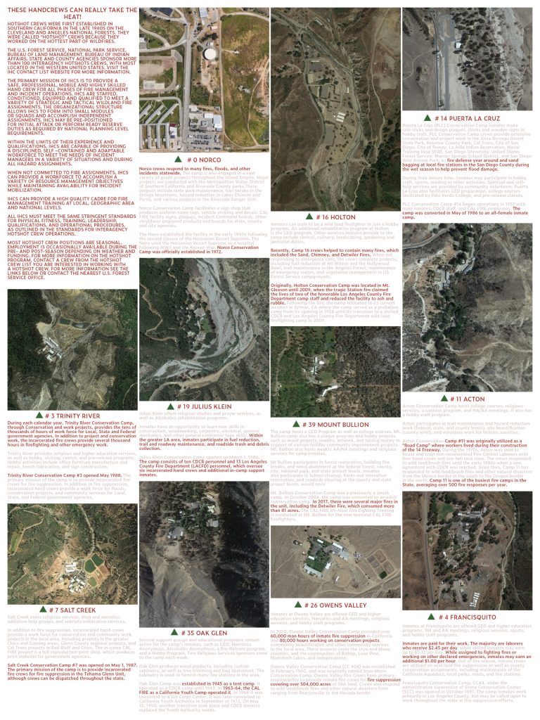 A newspaper-style inventory and description of the CALFIRE Inmate Program in California, as my individual research project for a studio mapping the incarceral landscape of New Jersey. This project used media representation of the program to tell the story of the program’s inmates, their duties in the fire prevention landscape of California, and their lives within the program’s system.
