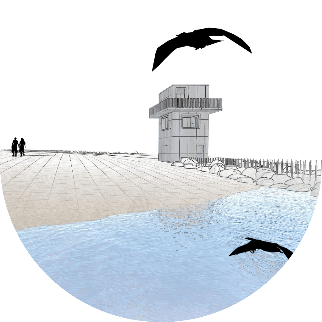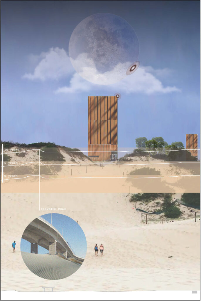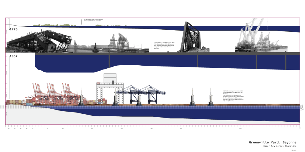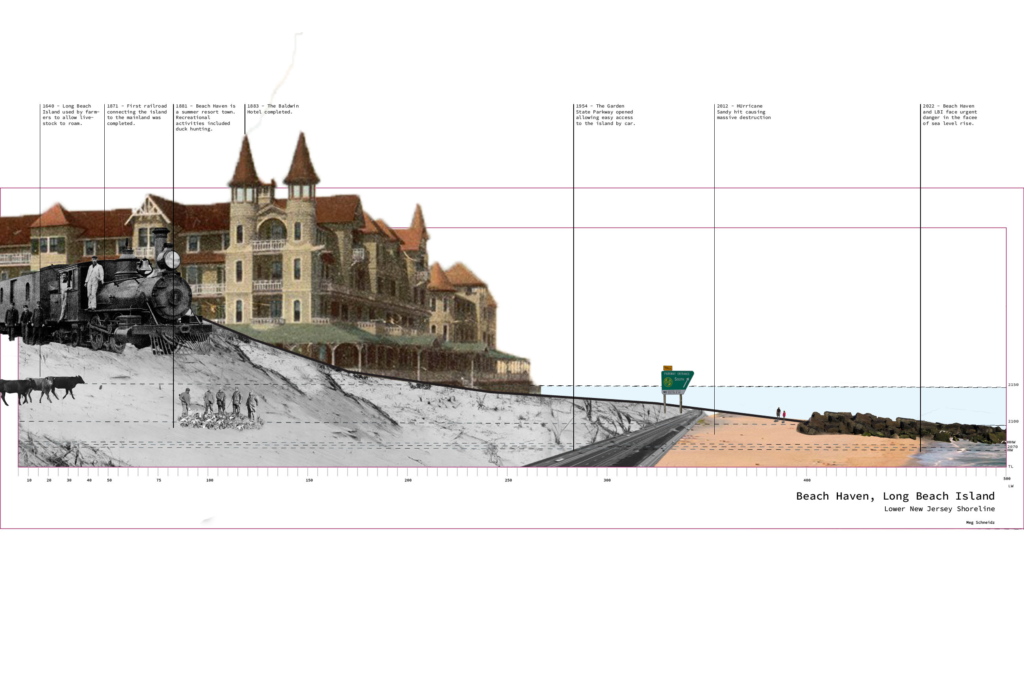 Instructed by Jessica Guinto of SCAPE, this 2022 studio work explored current and future coastline conditions in New Jersey. Along with Diana Boric and Meg Schneid, our team to analyzed the spatial relationship of energy, shoreline infrastructure, and time. Drawing on that original framework of changing infrastructure through time, Diana and I focused on a site within Sandy Hook, specifically the sand spit that connects the vegetated zone of Sandy Hook with the rest of New Jersey’s barrier islands. We created a design that combines power generation with wave energy mitigation and long-term sand deposition strategies, to stabilize this unstable and constantly shifting stretch of sand and road infrastructure.