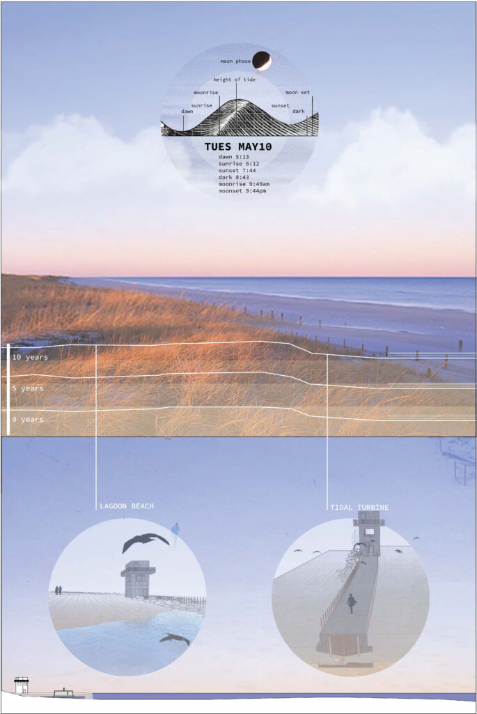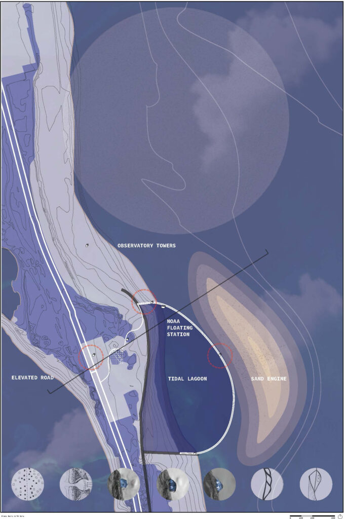 Our second and third strategies drew on international case studies: the Sand Motor project in Holland and the Sihwa Lake Power Station in South Korea. The Sand Motor relies on mass sand deposition and the continued forces of nature to spread sand along an under-sedimented beach to revitalize the recreational beaches downstream from the initial deposition site. The power station in Korea is an early example of large-scale use of tidal power generation, a new form of renewable hydroelectric power that uses the energy of long shore tides rather than the linear flow of a dammed river. In practice, a tidal generator only requires an enclosed region of water that has strong tidal flow and nearby transformers to send the power to, which we artificially created in our design by enclosing a stretch of beach. Using a small model (at the bottom of the following board), we tested various lagoon shapes and sand deposition formations along the spit to maximize sand spread along the Atlantic edge of Sandy Hook.